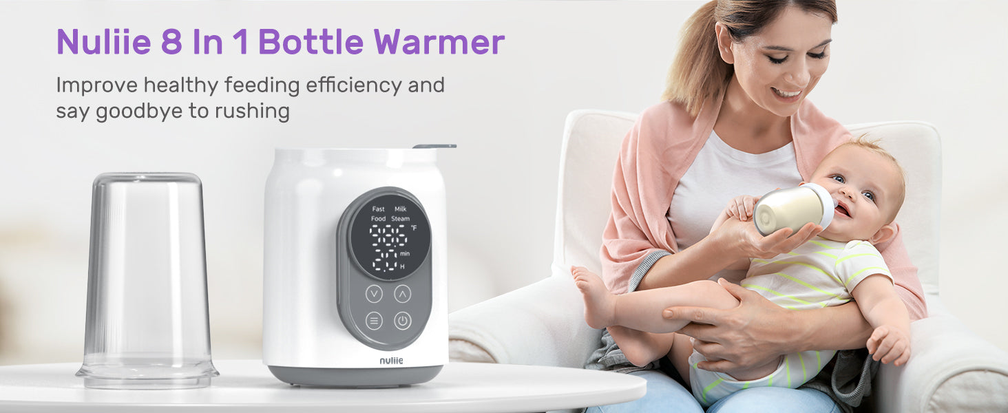 Nuliie Baby Bottle Warmer warms milk in 2 minutes with 6-in-1 functions: fast warming, constant warming, thawing, and sterilizing. Safe, efficient, and fits all bottle types—perfect for busy parents.
